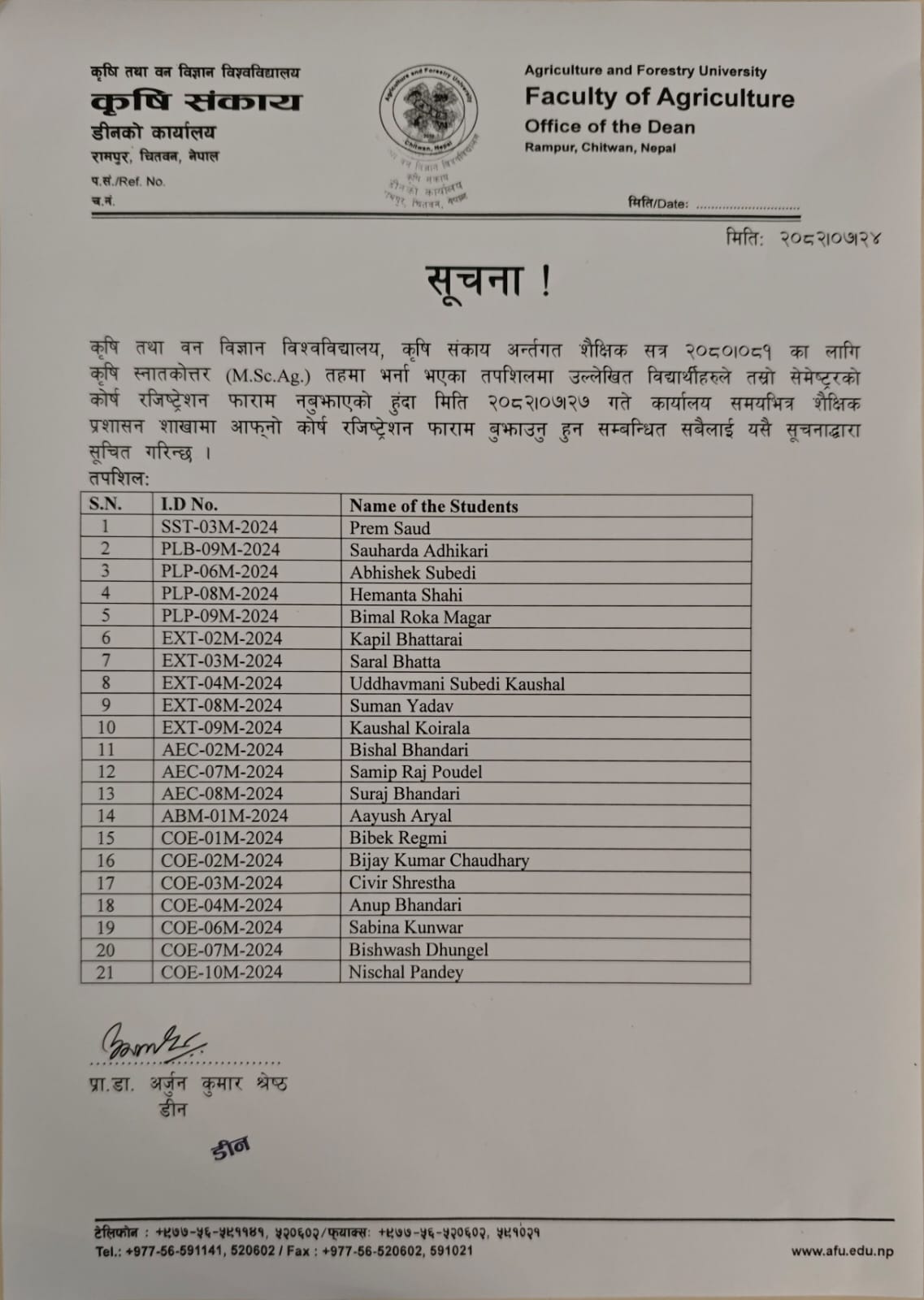 FOA - M.Sc. Ag. 3rd Sem 2080/081 Course registration notice